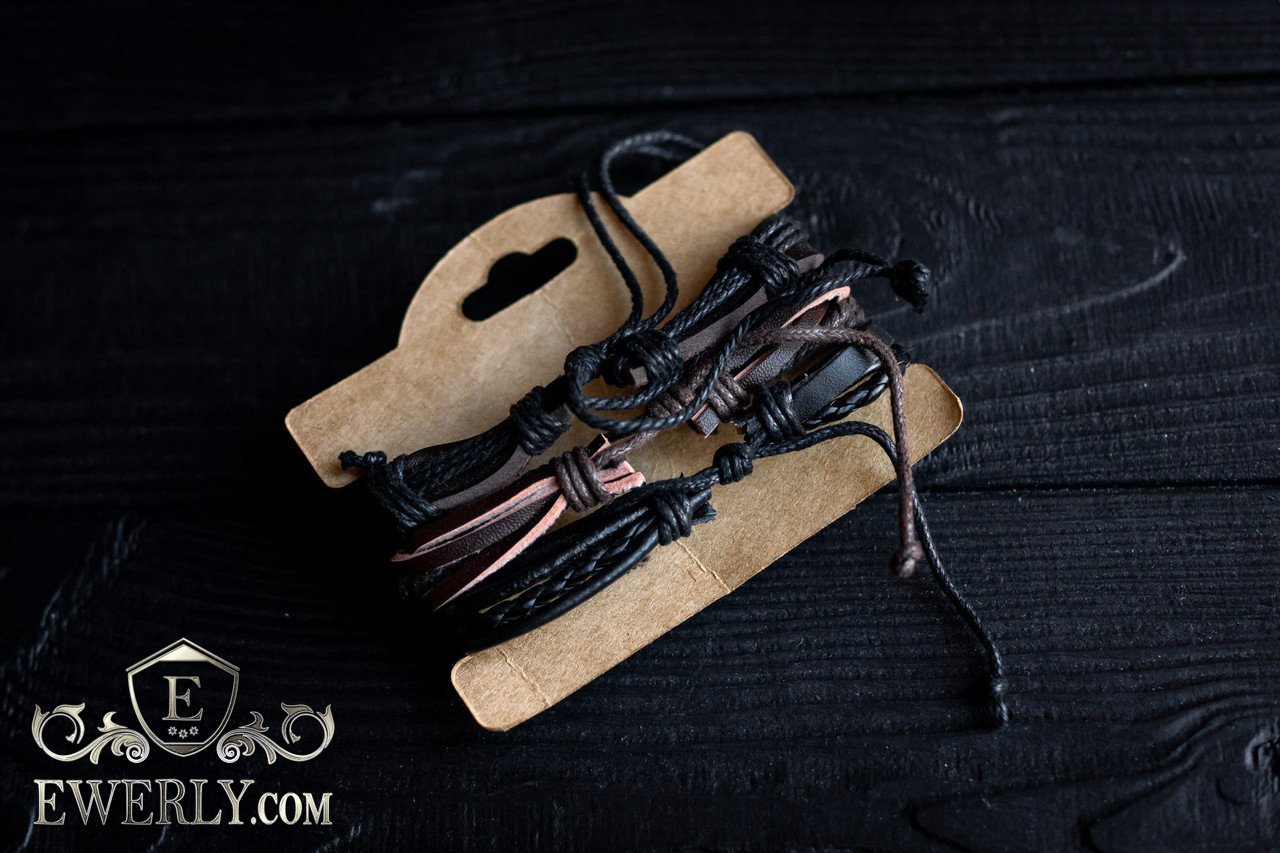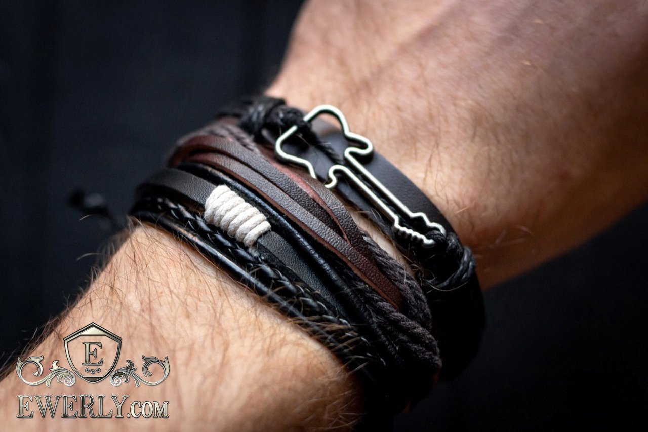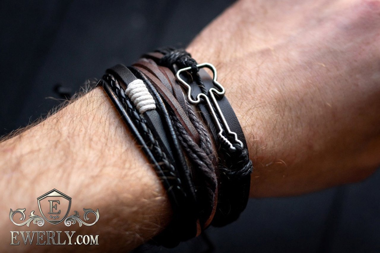 - Комплект мужских браслетов состоит из 4-ех браслетов из кожи на руку.