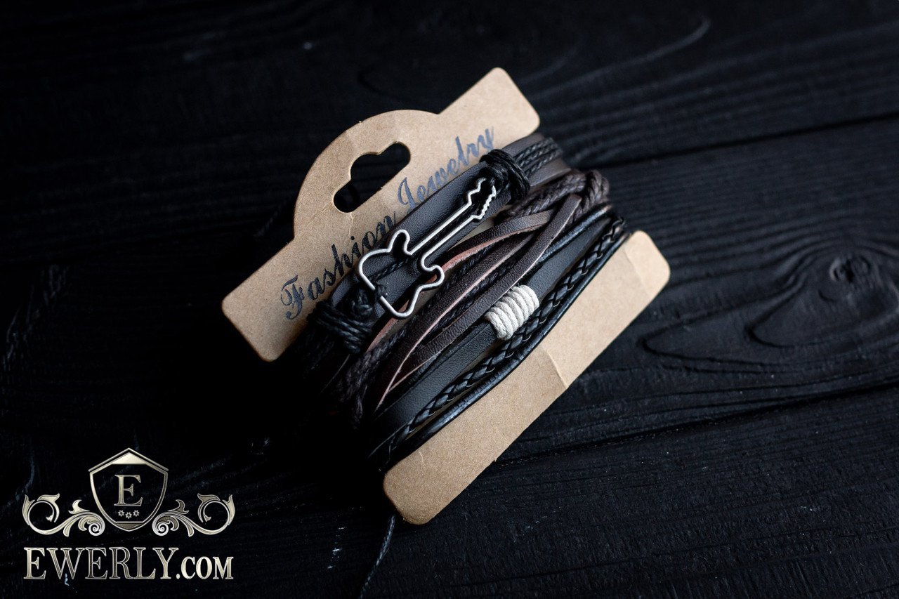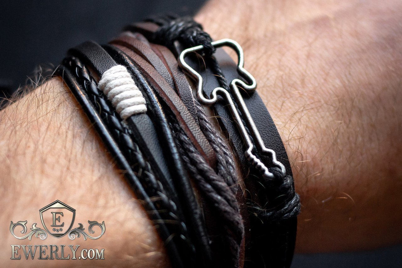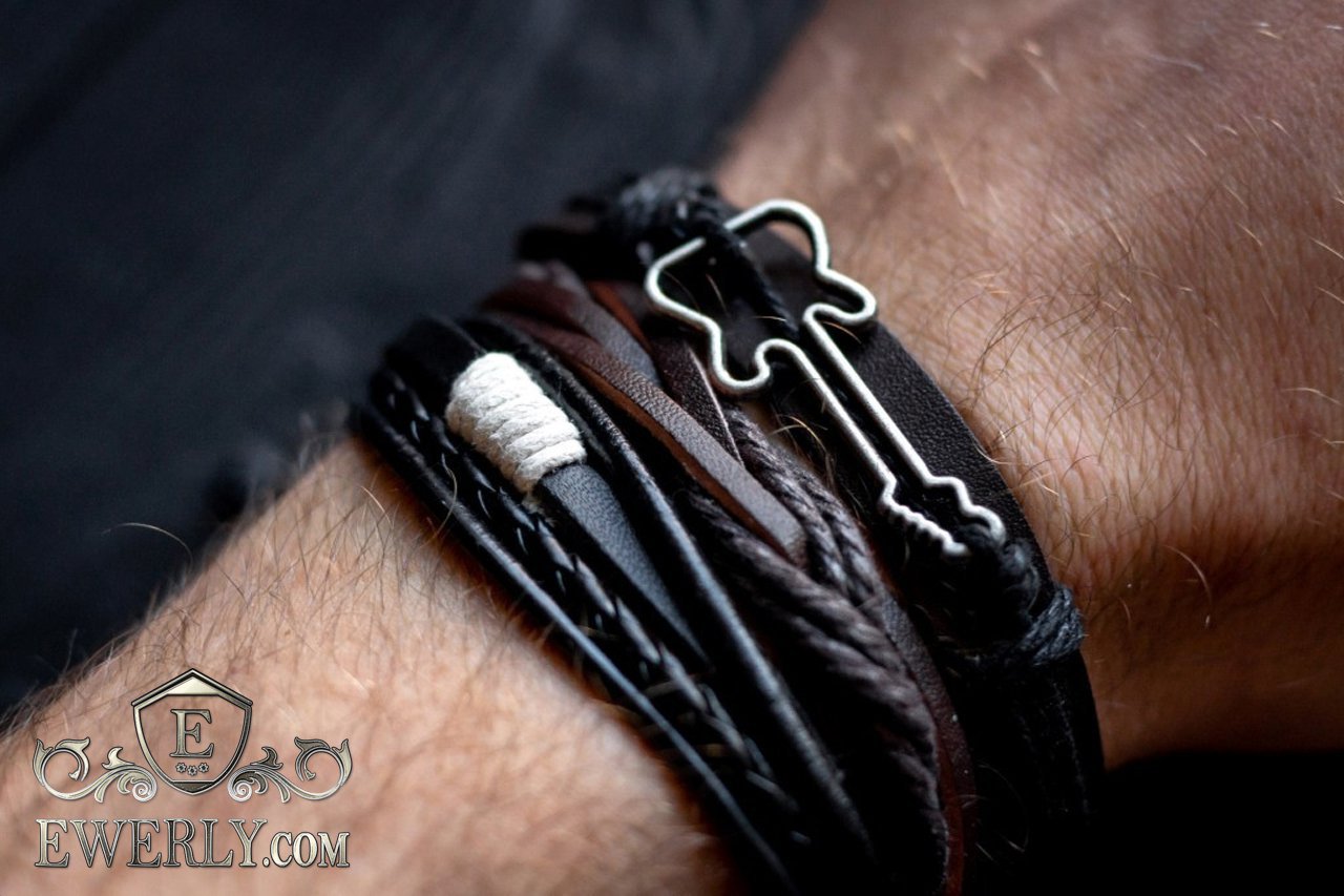 - Комплект мужских браслетов состоит из 4-ех браслетов из кожи на руку.