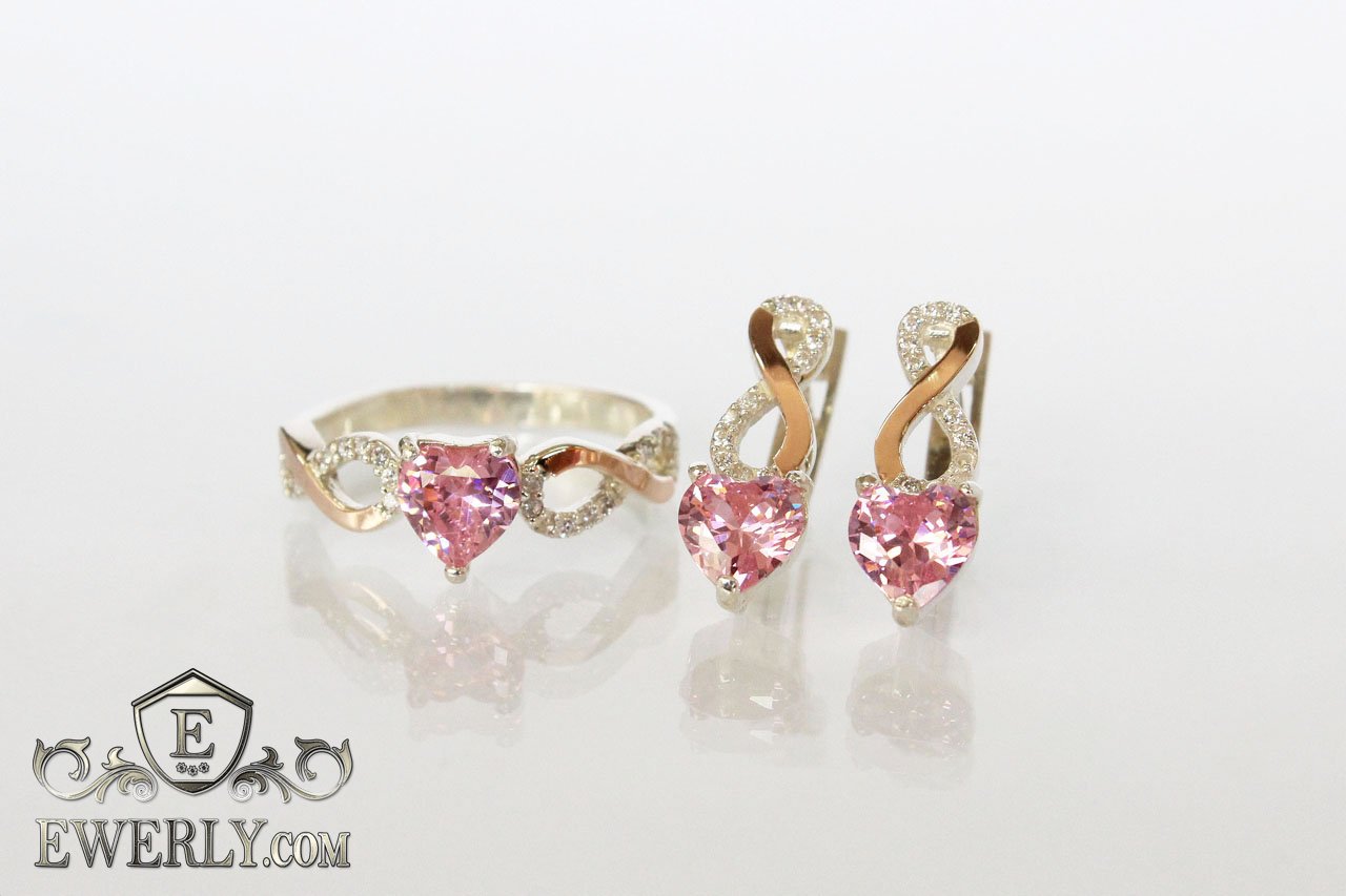 Набор: женские серебряные серёжки и кольцо из серебра 925 пробы с седцем и с золотыми вставками 375 пробы, розовый камень - фианит розового цвета.