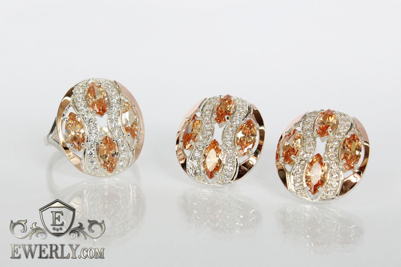 Женский комплект: серьги и кольцо из серебра с золотом и камнями (цвет-шампань)