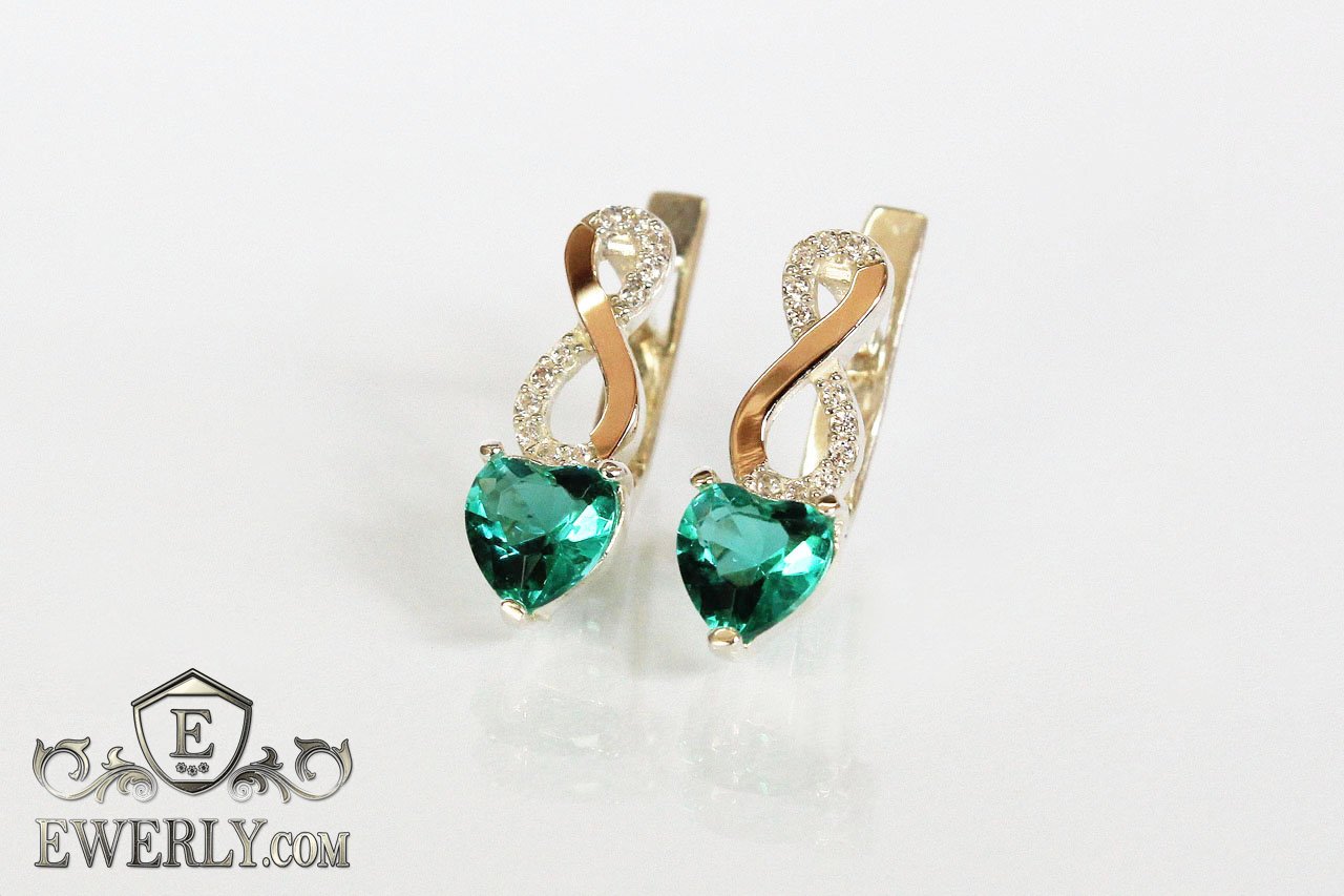 Женские серебряные серёжки 925 пробы с седцем и с золотыми вставками 375 пробы, камень зелёного цвета.