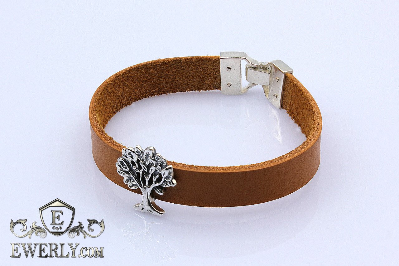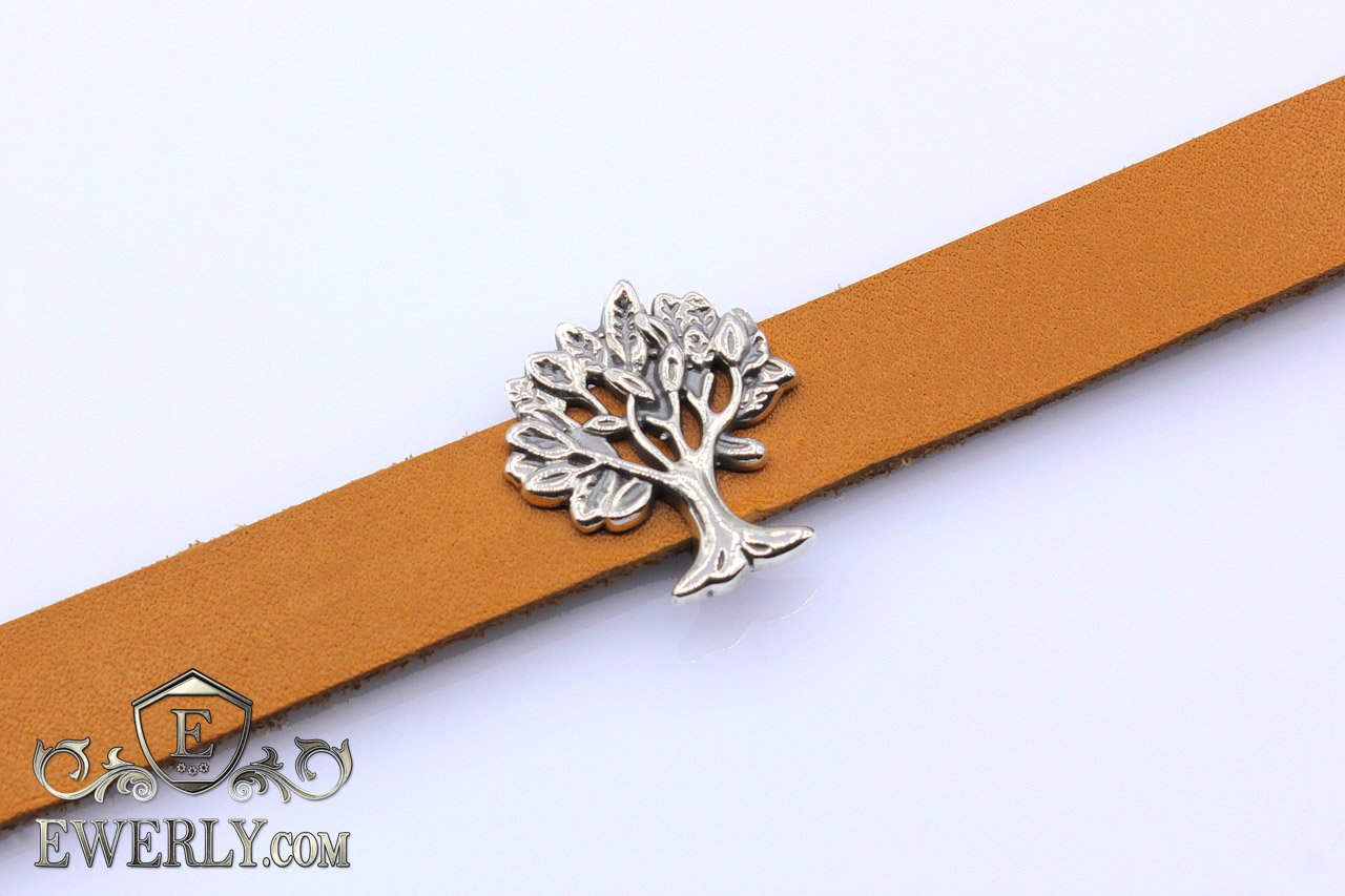 Женский браслет из натуральной кожи с серебряным замком и серебряной вставкой в виде дерева.