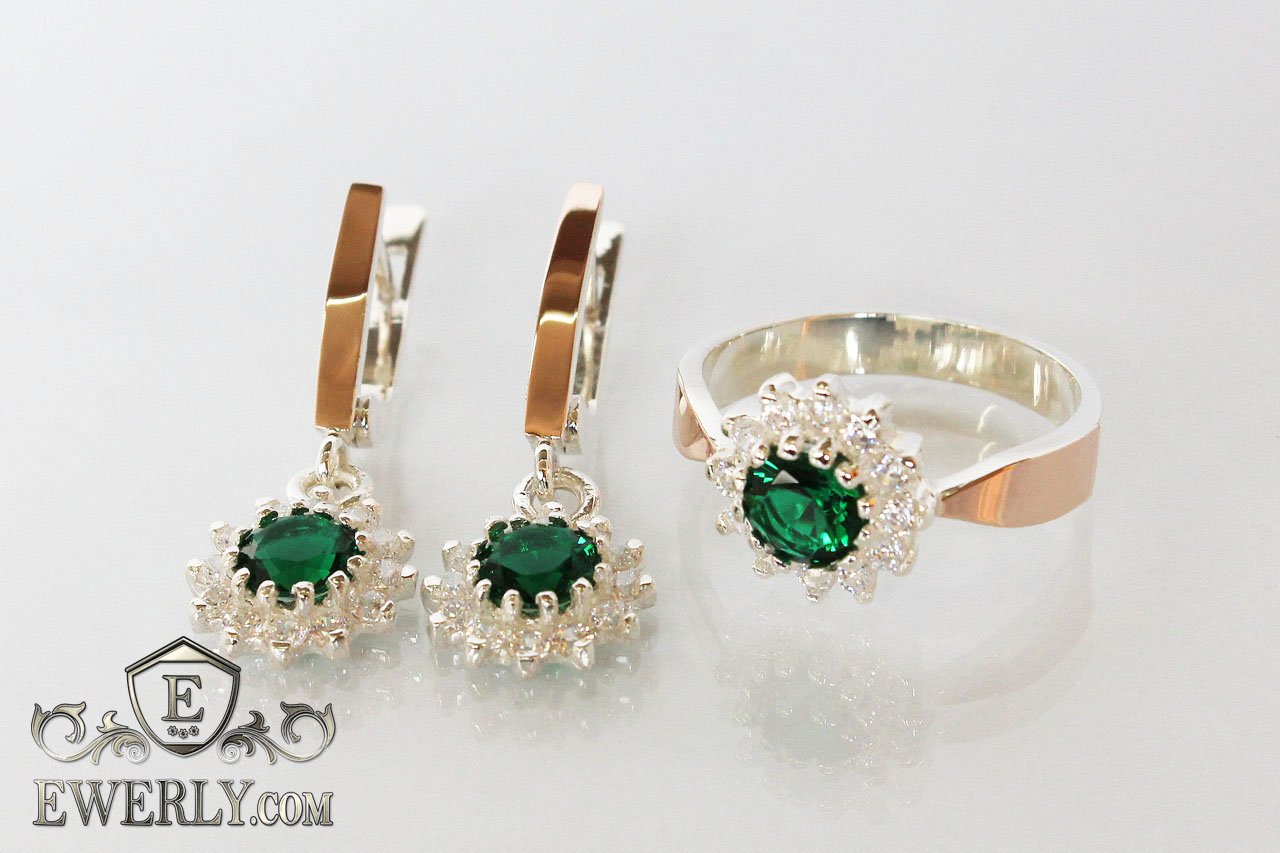 Женский комплект: серебряное кольцо и серёжки с зелёными камнями