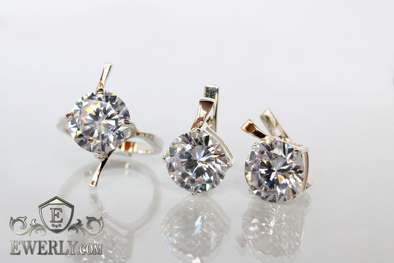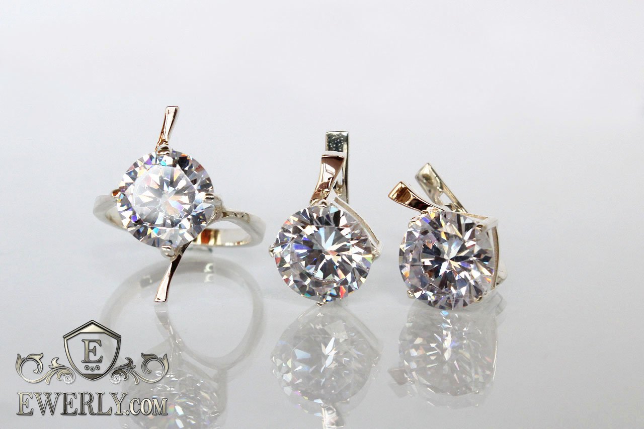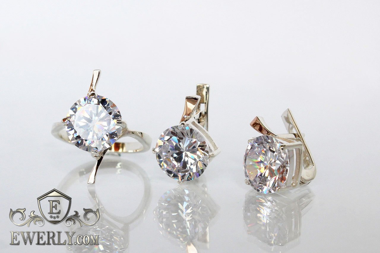 Женский набор: серебряное кольцо и серёжки с белыми камнями