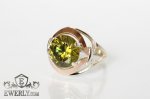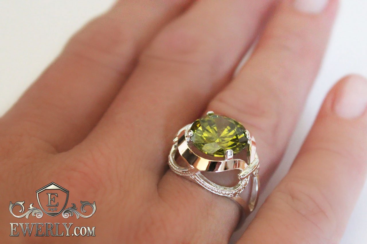 Женское серебряное кольцо 925 пробы с золотыми пластинами 375 пробы и фианитом (цвет - олива).
