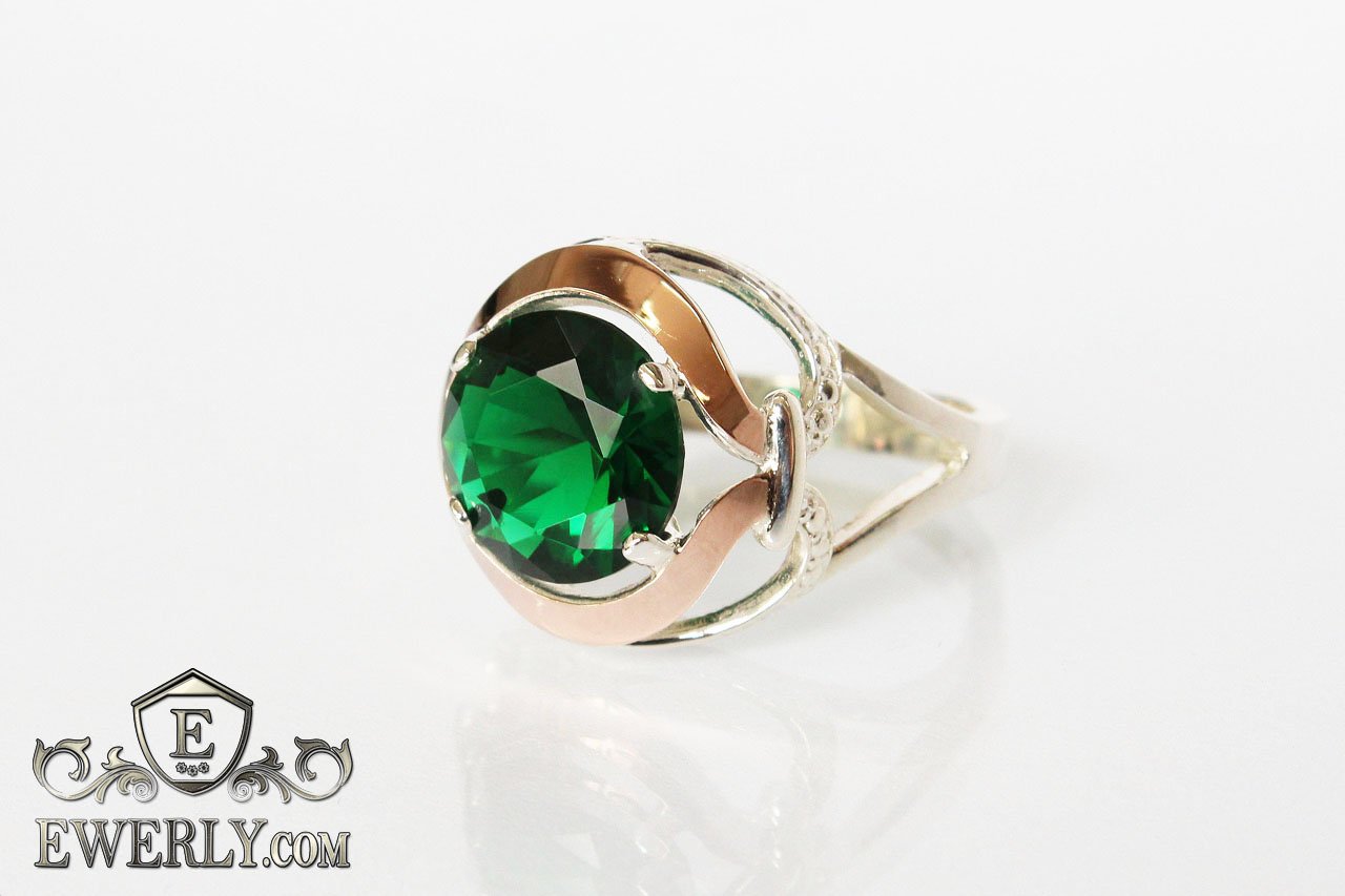 Кольцо из серебра 925 пробы с золотыми пластинами 375 пробы с зелёным фианитом для женщин.
