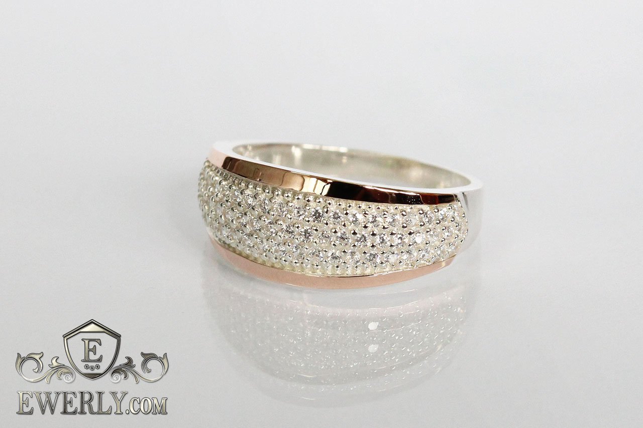 Женское серебряное кольцо 925 пробы с позолотой 375 пробы с белыми фианитами.