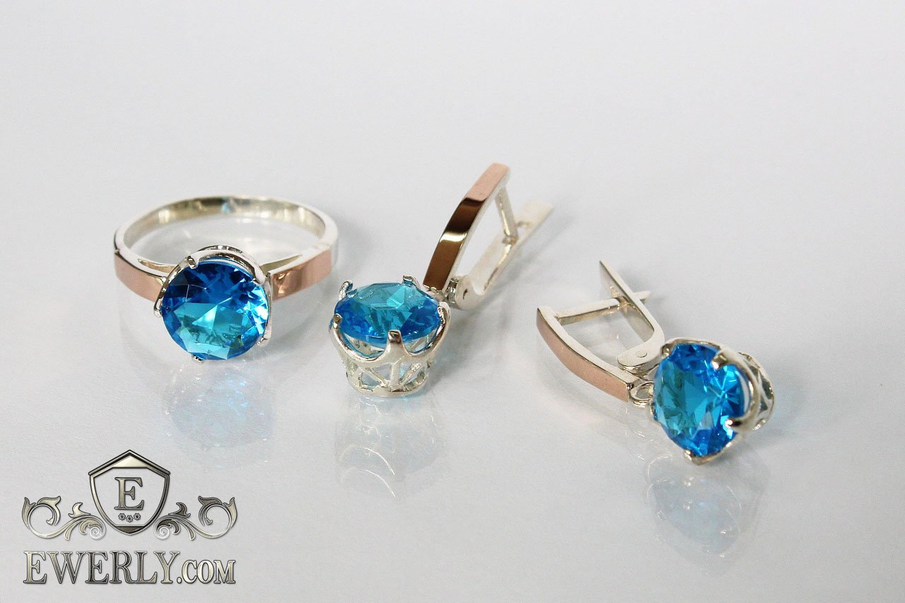 Серебряное кольцо и серьги с голубыми камнями для женщин