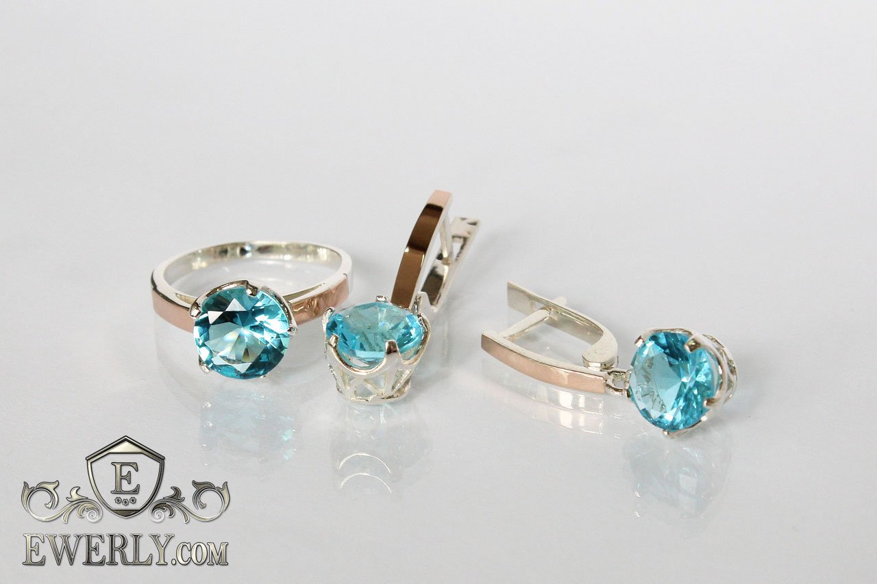 Серебряное кольцо и серьги со светло-голубыми камнями для женщин
