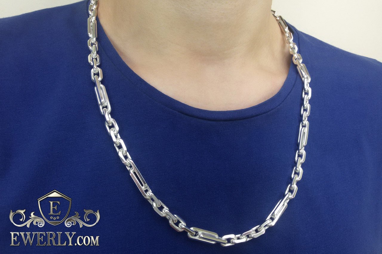 Полновесная цепочка. Серебряная цепь из плетения «Комбинированный якорь» весом около 100 грамм наравне с обычным якорным плетением при такой же массе имеют очень высокую прочность за счёт толстой проволоки в основании, из которой собственно и плетутся цепи. В отличии от обычной якорной комбинированный якорь имеет продолговатые звенья попарно спаянные между собой, которые чередуются со звеньями стандартной длины, что хорошо видно на фото.