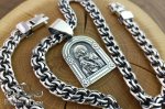 Представляем комплект из двух выразительных ювелирных украшений, выполненных из серебра 925 пробы: массивная мужская цепь плетения Бисмарк весом 120 грамм и нательная иконка с образом Владимирской Божьей Матери весом 33 грамма. Оба изделия выполнены с применением чернения, которая подчёркивает рельеф и добавляет глубину деталям.