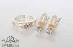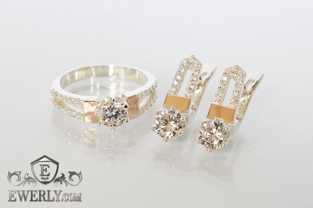 Женские серебряные серьги и кольцом с белыми камнями и золотом