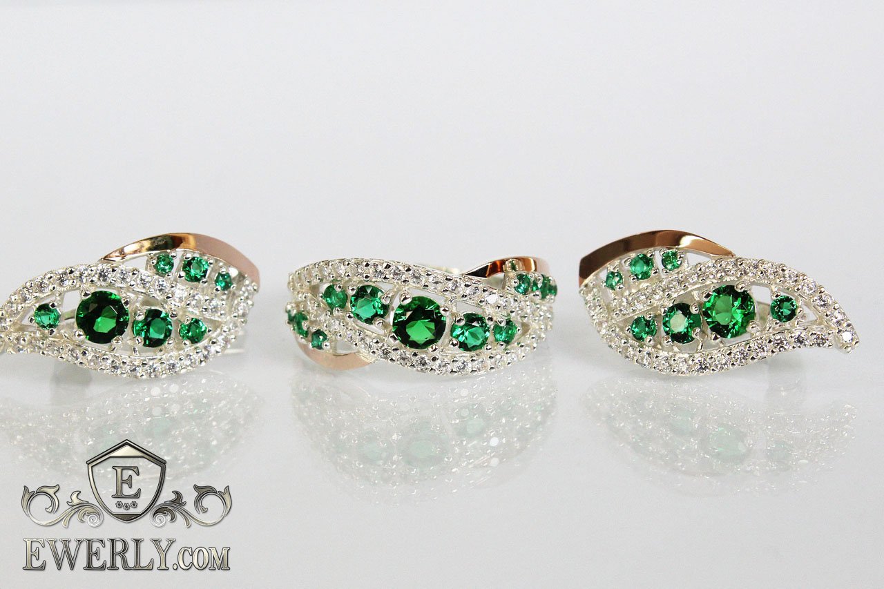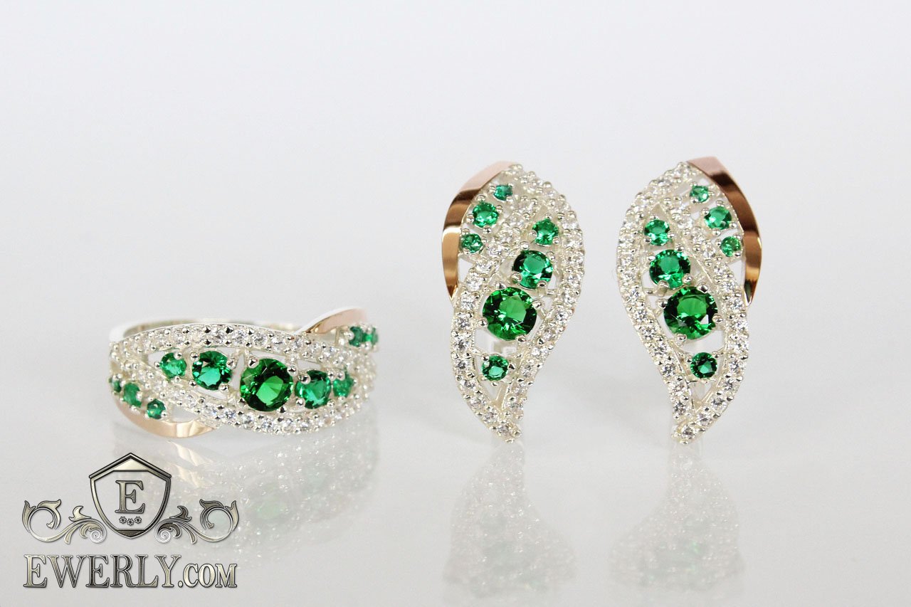 Женский набор: серьги и кольцо из серебра с золотом и зелёными камнями