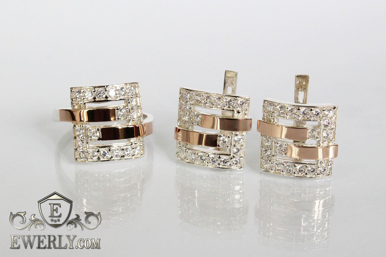 Широкие женские серебряные серьги и кольцо с золотми пластинами и белыми камнями - фианитами.