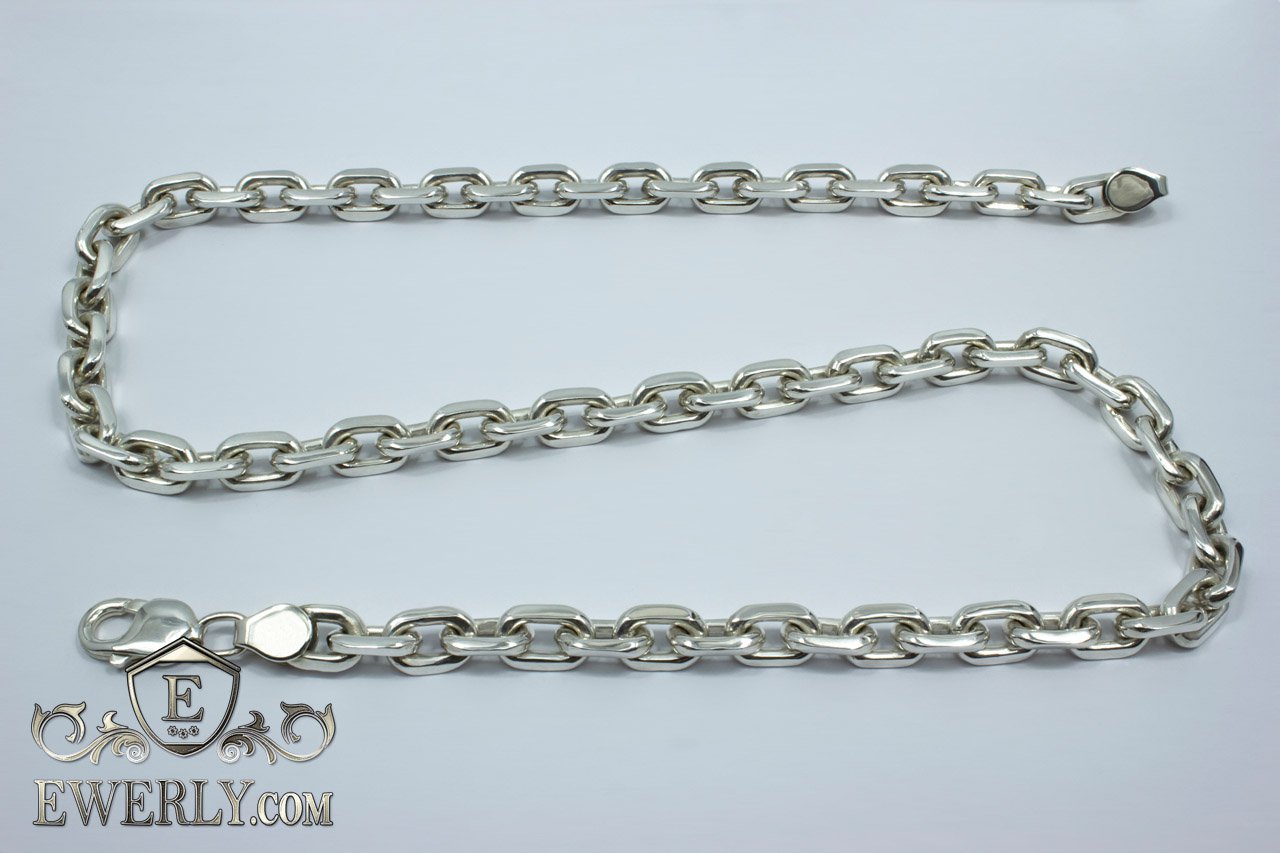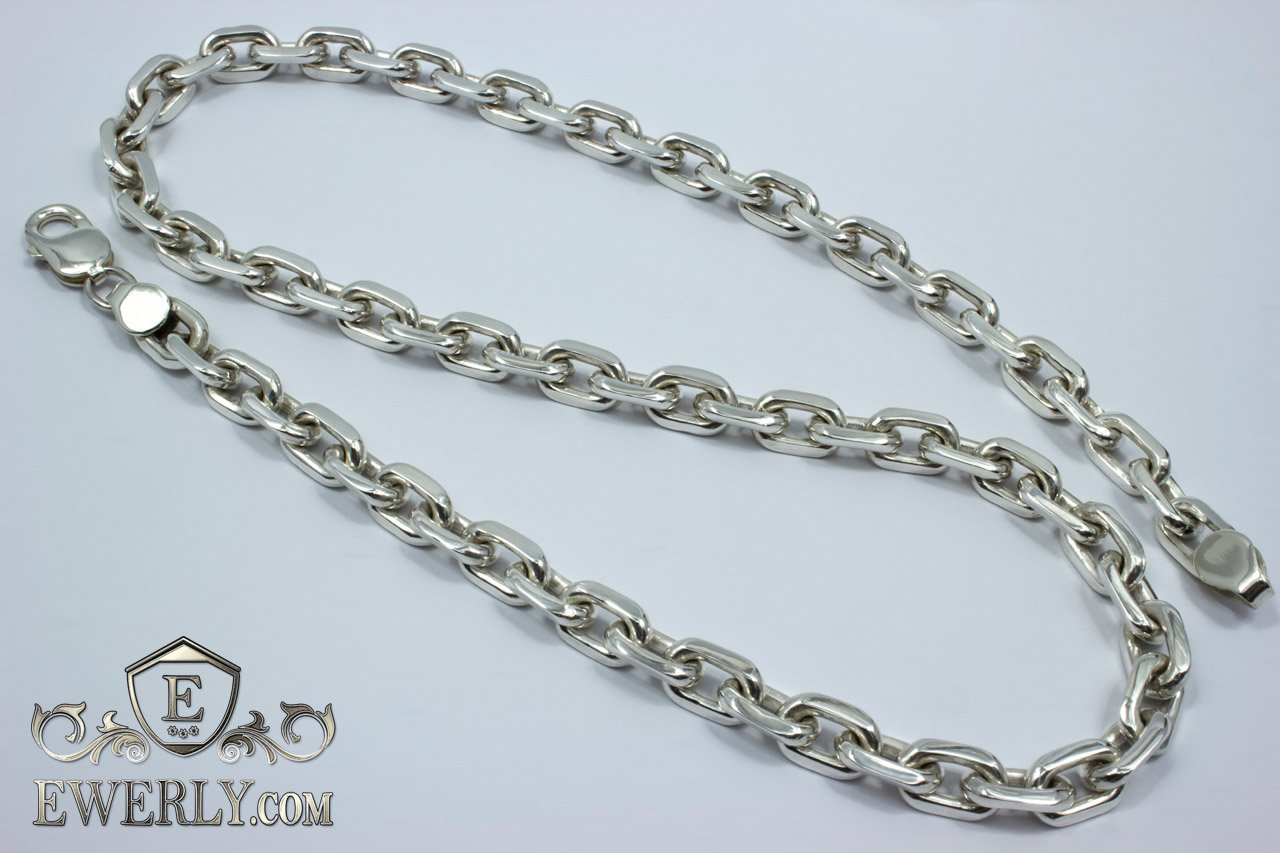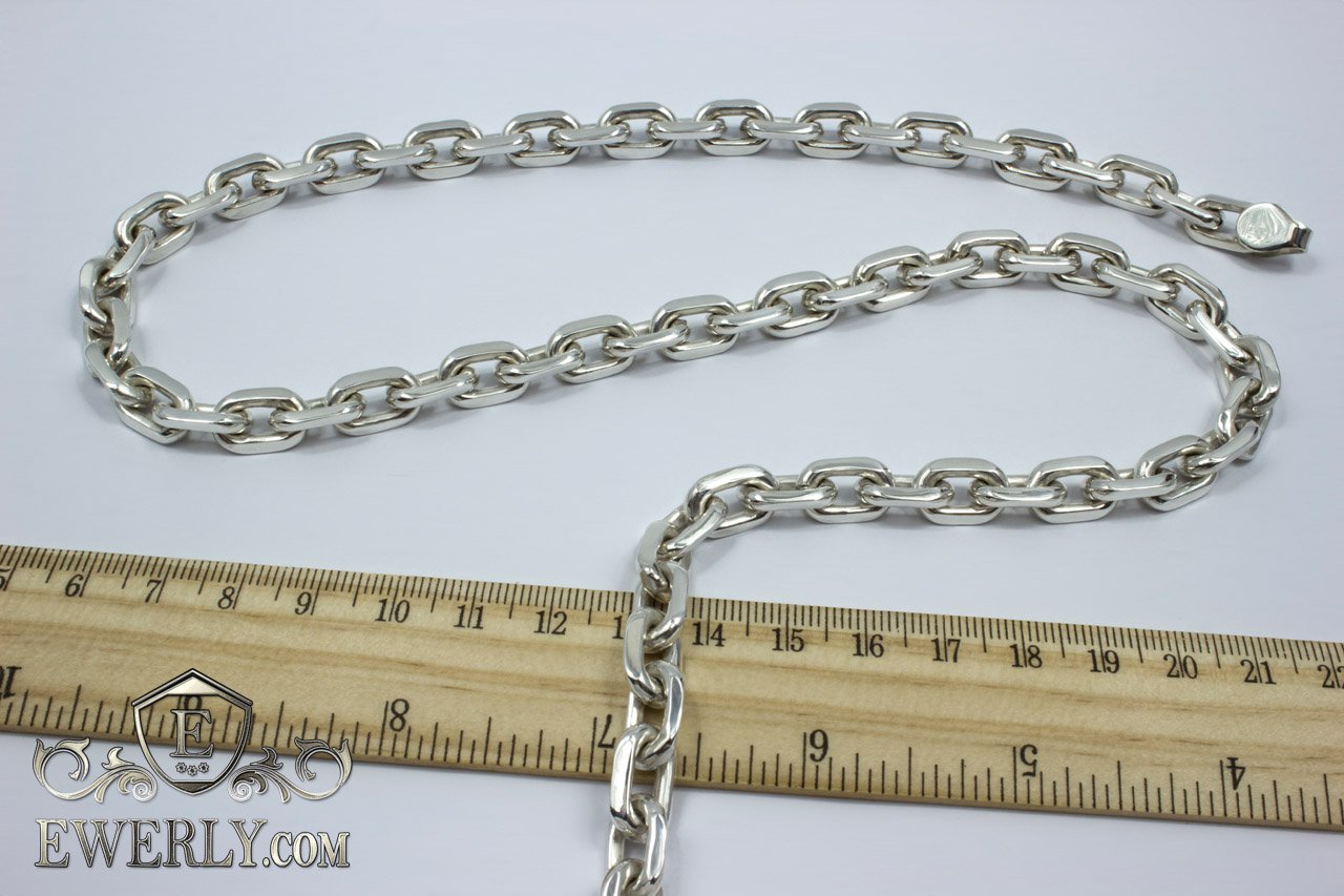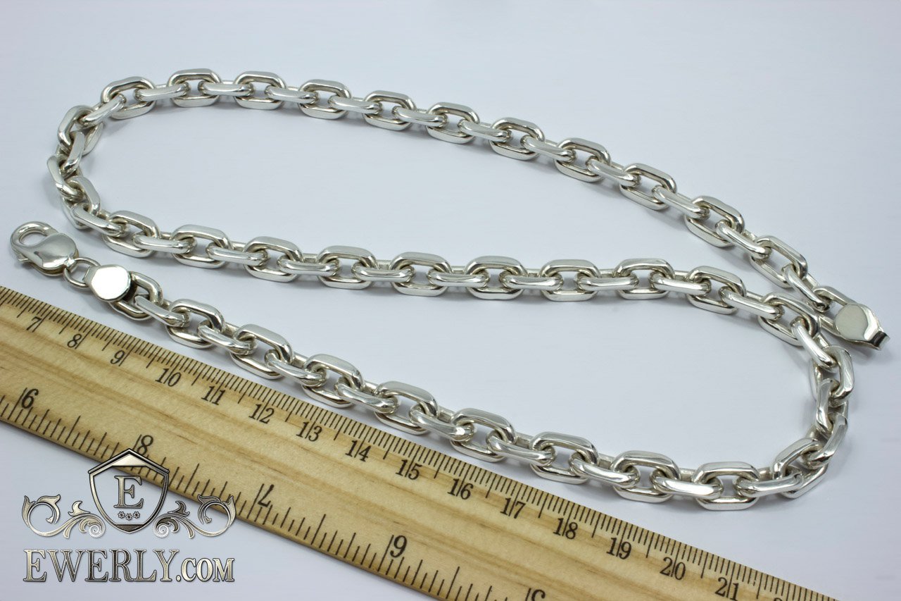 Полновесная цепочка. На фото изображена якорная серебряная цепь массой более 100 грамм и длиной около 60 см. Как показывает практика, цепочка с такими размерами привлечёт скорее мужское внимание, поэтому данную цепочку можно по достоинству назвать «мужской». Но не спешите закрывать страницу, если Вас не устраивают её размеры, ведь Вы всегда с лёгкостью сможете настроить её параметры (нажав на ссылку "Выбрать другие размеры") так, как считаете наиболее подходящими, отчего также может измениться и её стоимость.