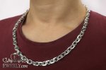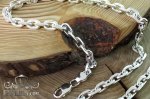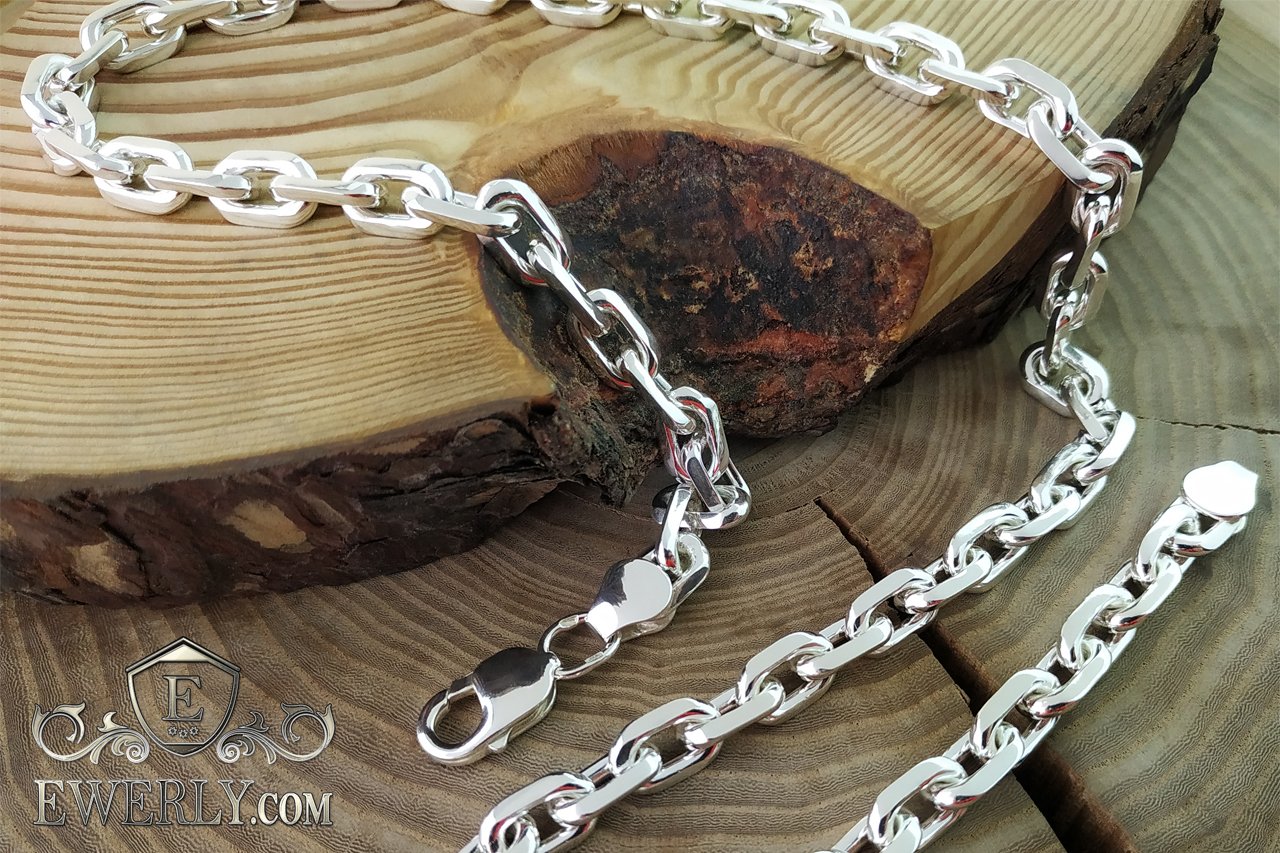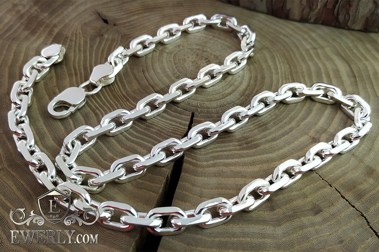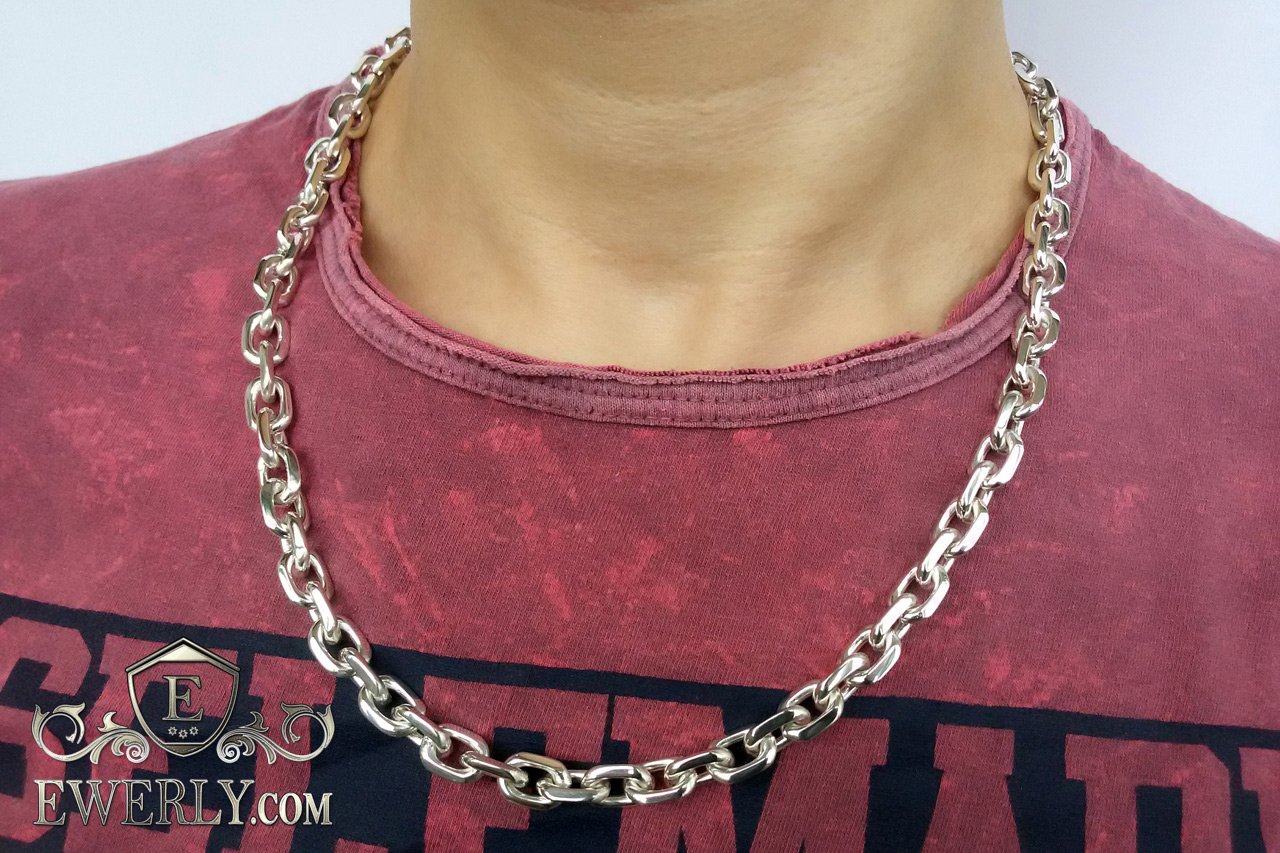 Полновесная цепочка. На фото изображена якорная серебряная цепь массой более 100 грамм и длиной около 60 см. Как показывает практика, цепочка с такими размерами привлечёт скорее мужское внимание, поэтому данную цепочку можно по достоинству назвать «мужской». Но не спешите закрывать страницу, если Вас не устраивают её размеры, ведь Вы всегда с лёгкостью сможете настроить её параметры (нажав на ссылку "Выбрать другие размеры") так, как считаете наиболее подходящими, отчего также может измениться и её стоимость.