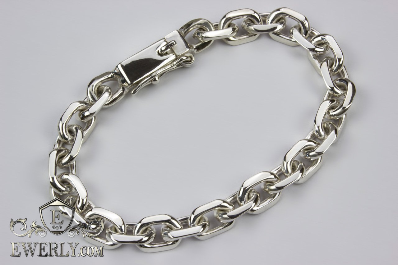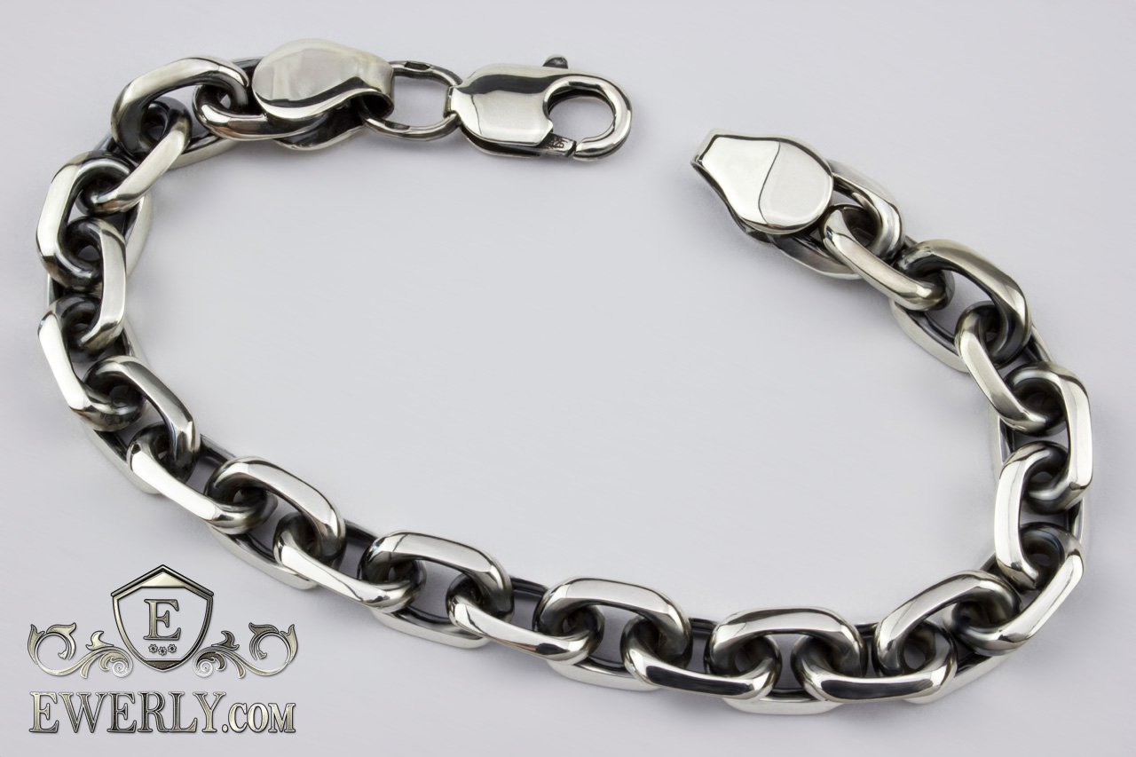 Полновесный браслет. На текущей странице изображено фото мужского серебряного браслета якорного плетения с чернением. Мужским его в первую очередь делают размеры, да и, откровенно говоря, угловатые и несколько грубые формы «Якоря с гранями» в качестве браслета не часто пользуются спросом у девушек, хотя безусловно есть и такие.