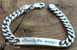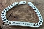 Полновесный браслет. На фото изображен серебряный браслет с чернением, выполненный из панцирного плетения. Особенностью этого браслета является наличие пластины, на которой выгравирован надпись "Завжди поруч".