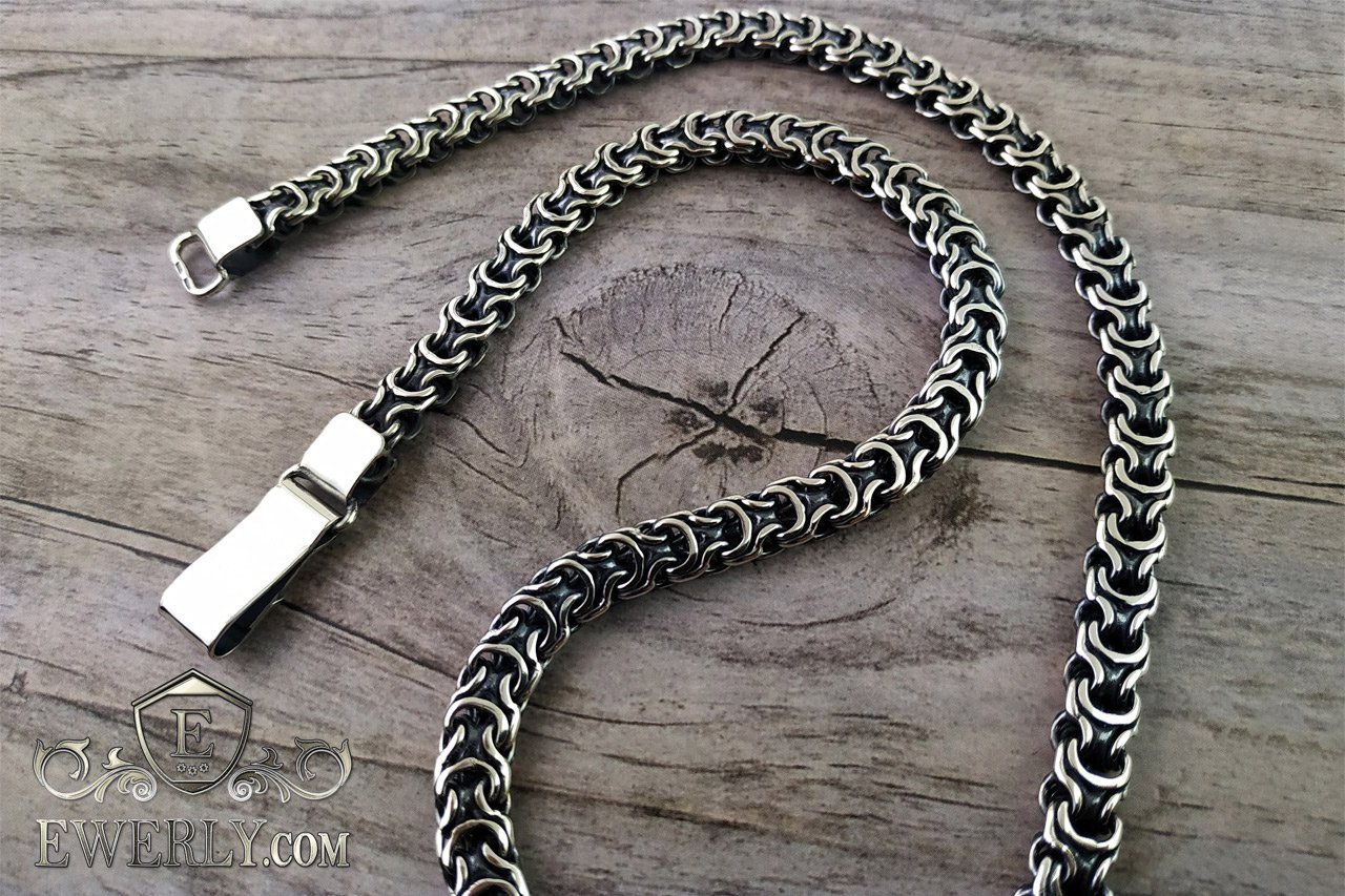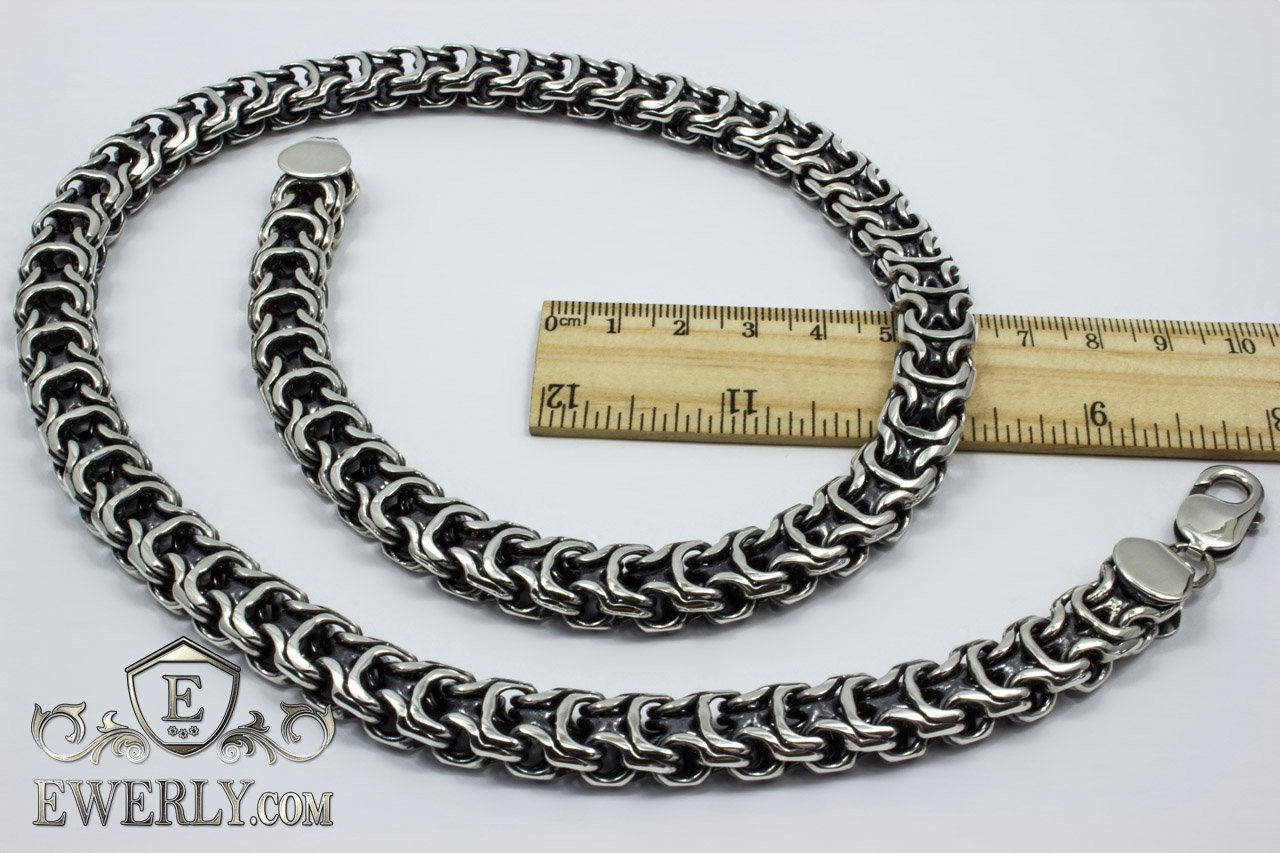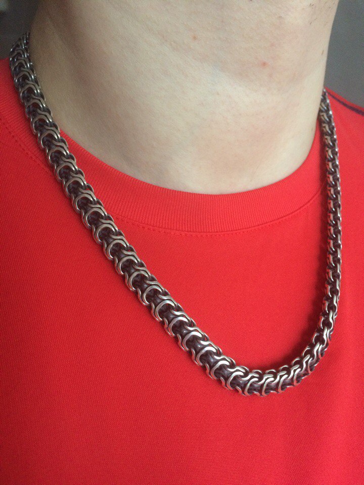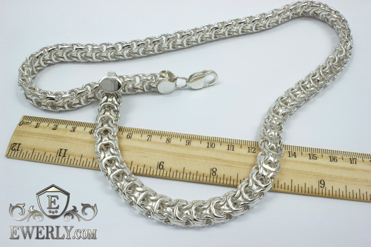 Полновесная цепочка. Очень популярное среди мужчин плетение «Рамзес», также на просторах интернета данное плетение можно увидеть под названием «Двойной обратный бисмарк». В особенности мужское внимание привлекают толстые серебряные цепочки из «Двойного обратного бисмарка» с размерами близкими к размерам на фото. И тем не менее, если такая цепочка лично для Вас смотрится на шее весьма громоздкой или наоборот маловатой, то Вы без особого труда можете откорректировать практически любой её параметр под свои вкусы, в том числе есть возможность выбрать как с чернением, так и нечернёную или же с родированием.