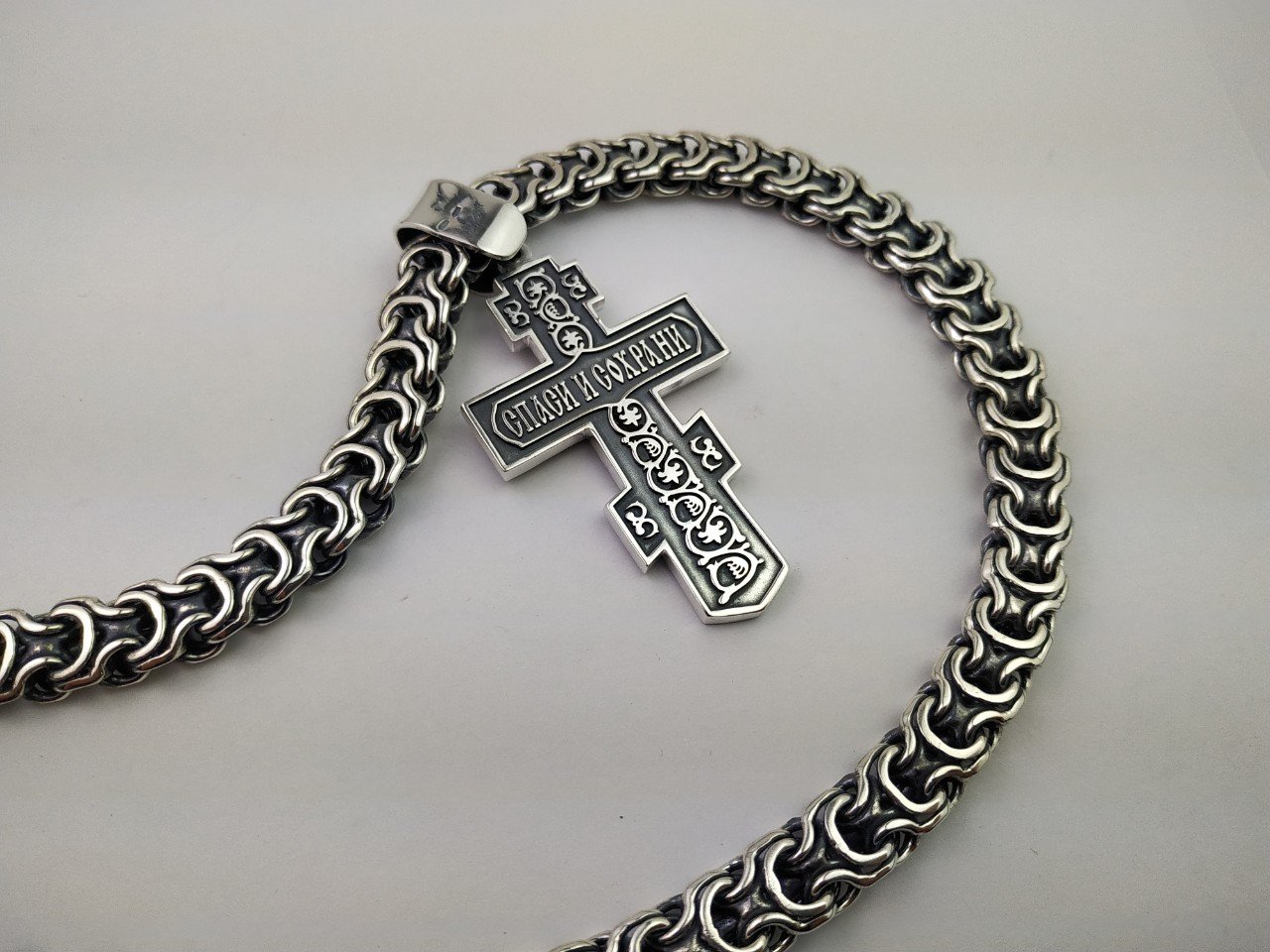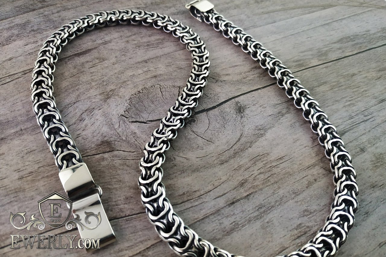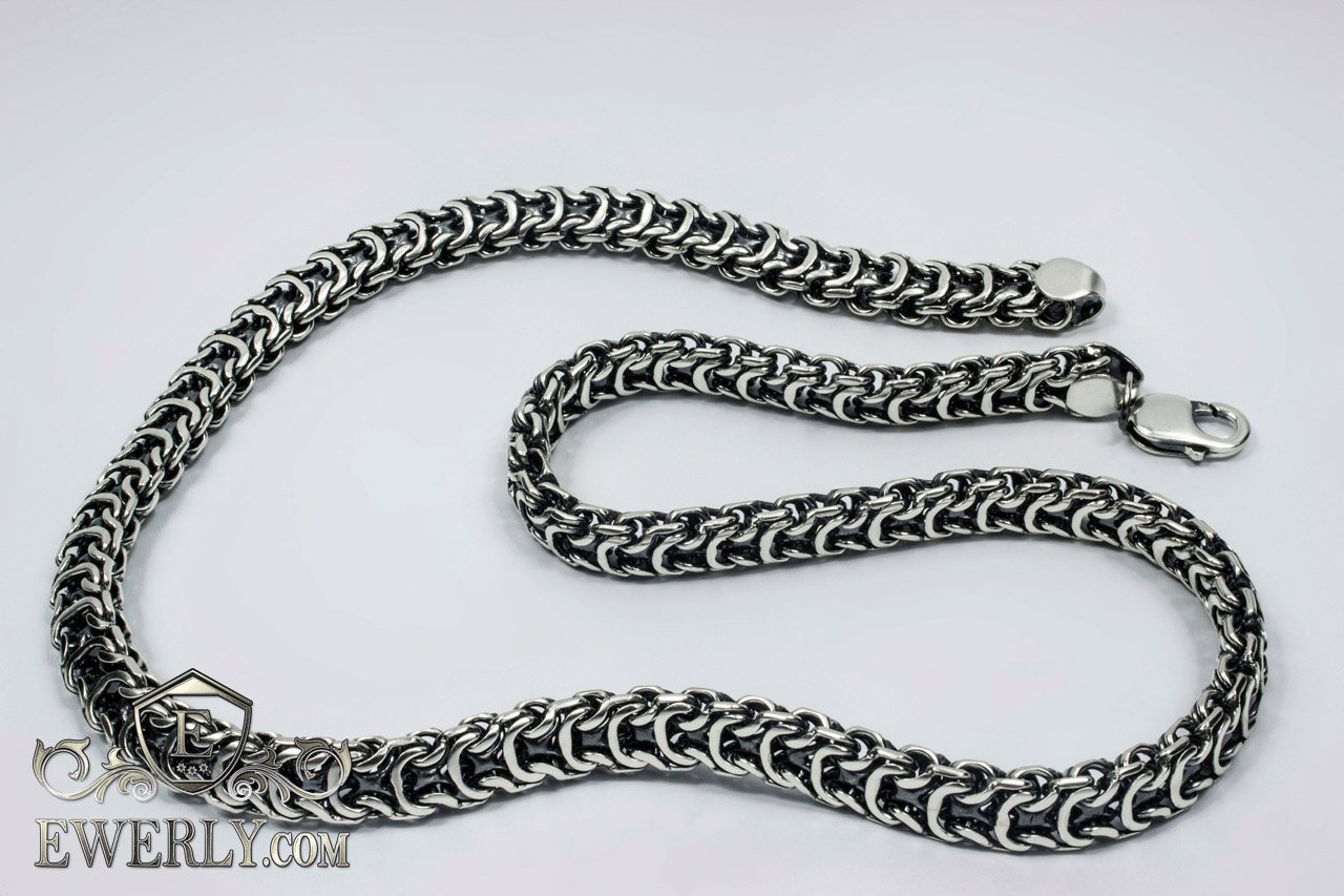 Полновесная цепочка. Очень популярное среди мужчин плетение «Рамзес», также на просторах интернета данное плетение можно увидеть под названием «Двойной обратный бисмарк». В особенности мужское внимание привлекают толстые серебряные цепочки из «Двойного обратного бисмарка» с размерами близкими к размерам на фото. И тем не менее, если такая цепочка лично для Вас смотрится на шее весьма громоздкой или наоборот маловатой, то Вы без особого труда можете откорректировать практически любой её параметр под свои вкусы, в том числе есть возможность выбрать как с чернением, так и нечернёную или же с родированием.