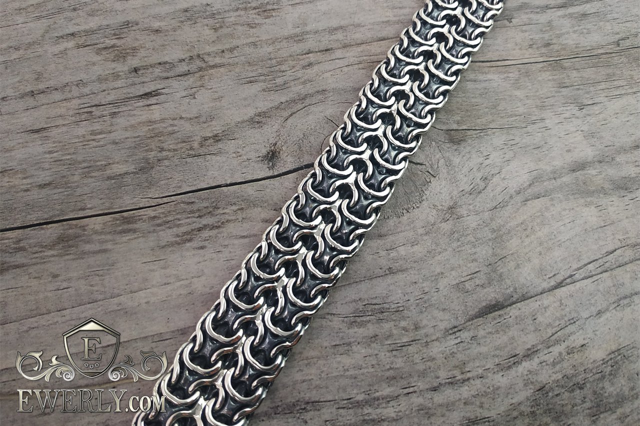 Полновесное плетение.Мужское плетение из серебра "Двойной рамзес". Доступны к изготовлению браслеты практически любых размеров от массы, начиная с 30 грамм. Серебряные цепочки из этого плетения не менее 80 грамм. На свой вкус можно выбрать длину, ширину, массу, замок и покрытие.