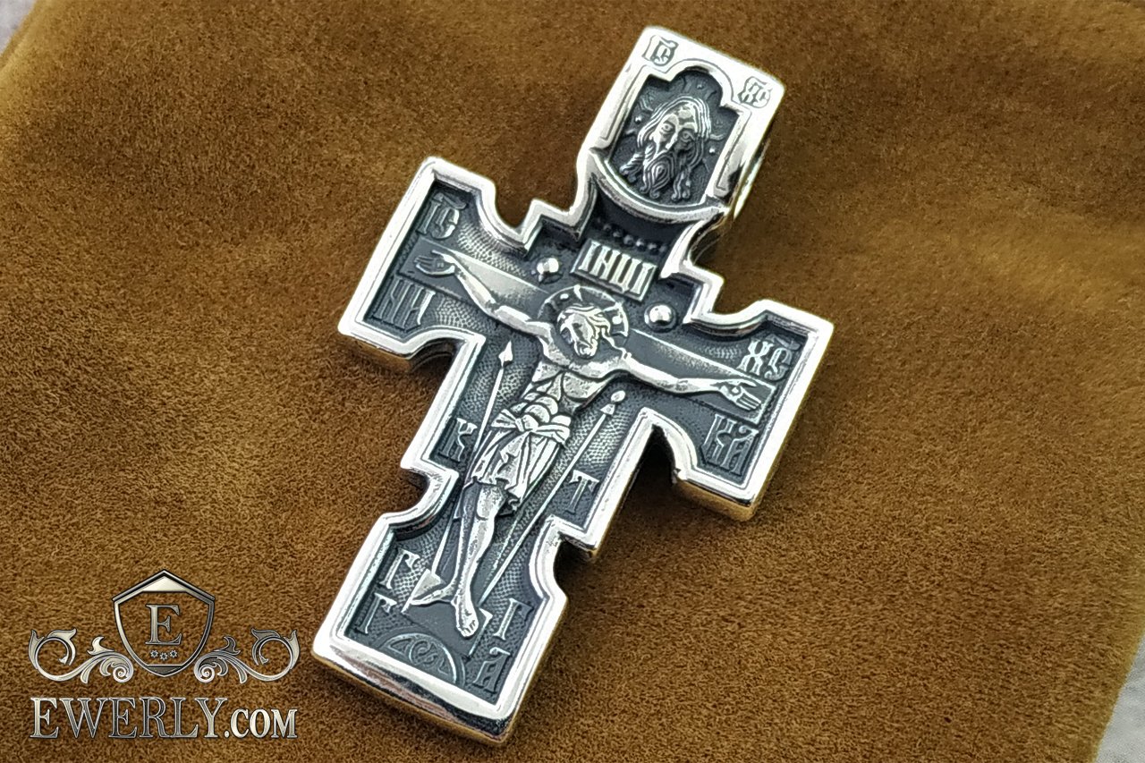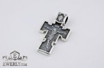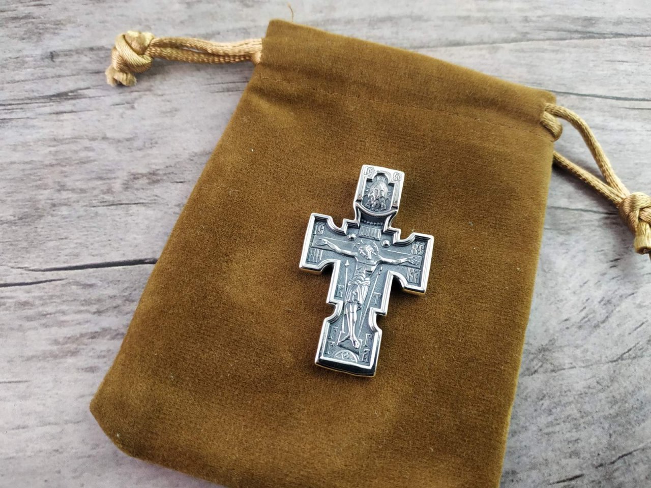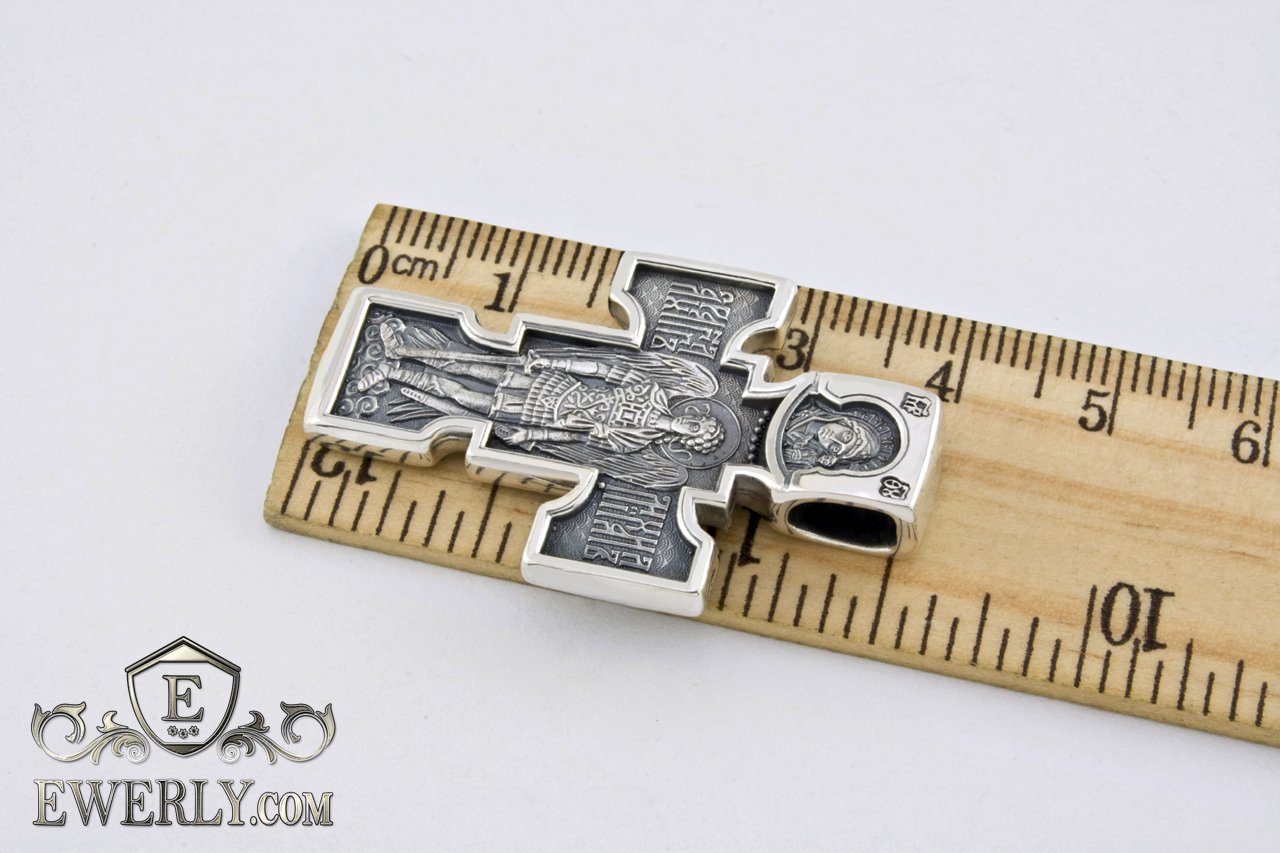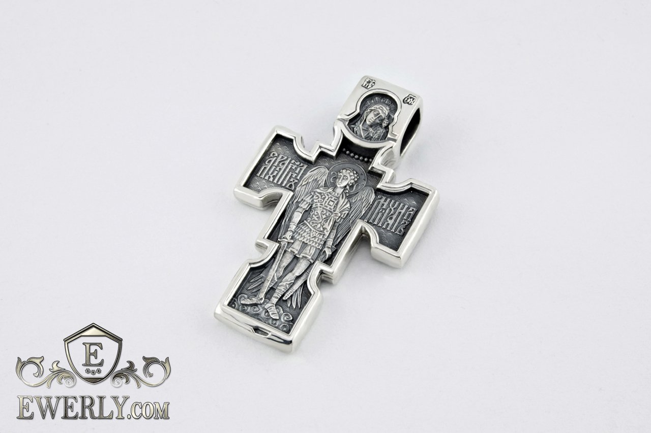 Изображено на фото: Православный наперсный крест с чернением. С одной стороны распятие Христово. С другой стороны Архангел Михаил и Казанская икона Божией Матери.Высота: 6.5 мм