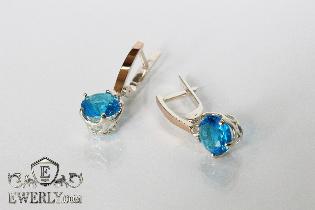 Серёжки из серебра 925 пробы для девушки с золотыми вставками 375 пробы и голубыми камнями - фианитами.