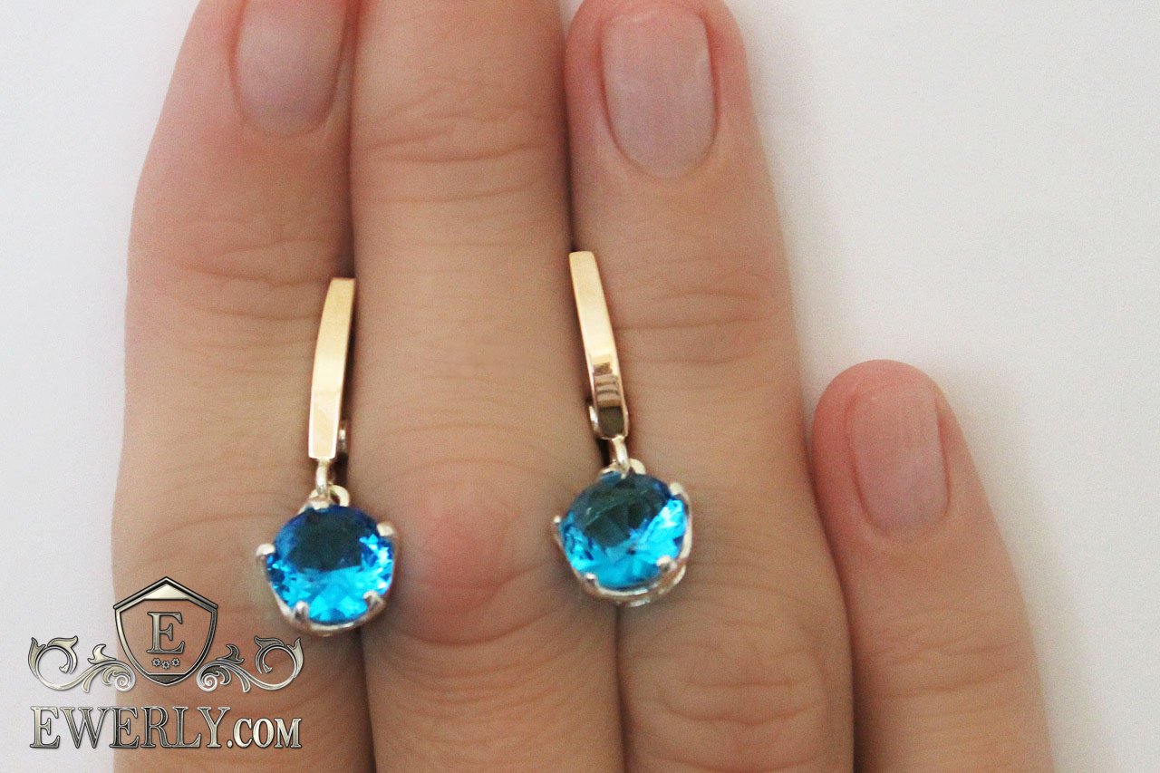 Женские серёжки из серебра с голубыми камнями (золотые вставки)