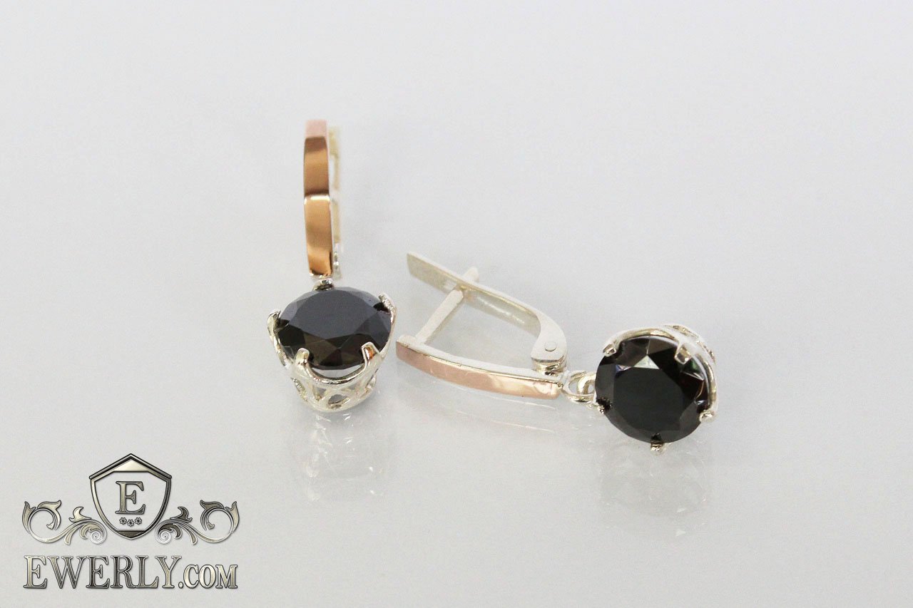Серёжки из серебра 925 пробы для девушки с золотыми вставками 375 пробы и чёрными камнями - фианитами.