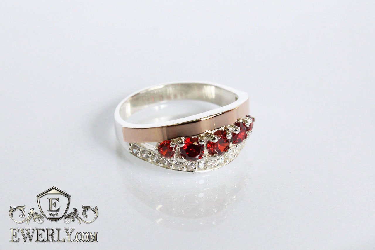 Женское кольцо из серебра 925 пробы с золотой вставкой 375 пробы с фианитами гранатового цвета.
