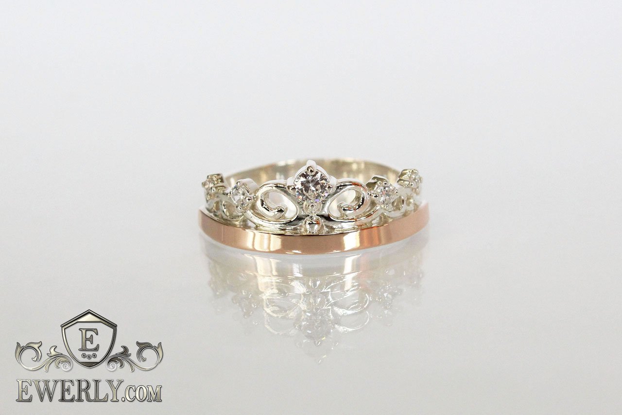 Серебряное кольцо - корона с белыми фианитами и золотой вставкой
