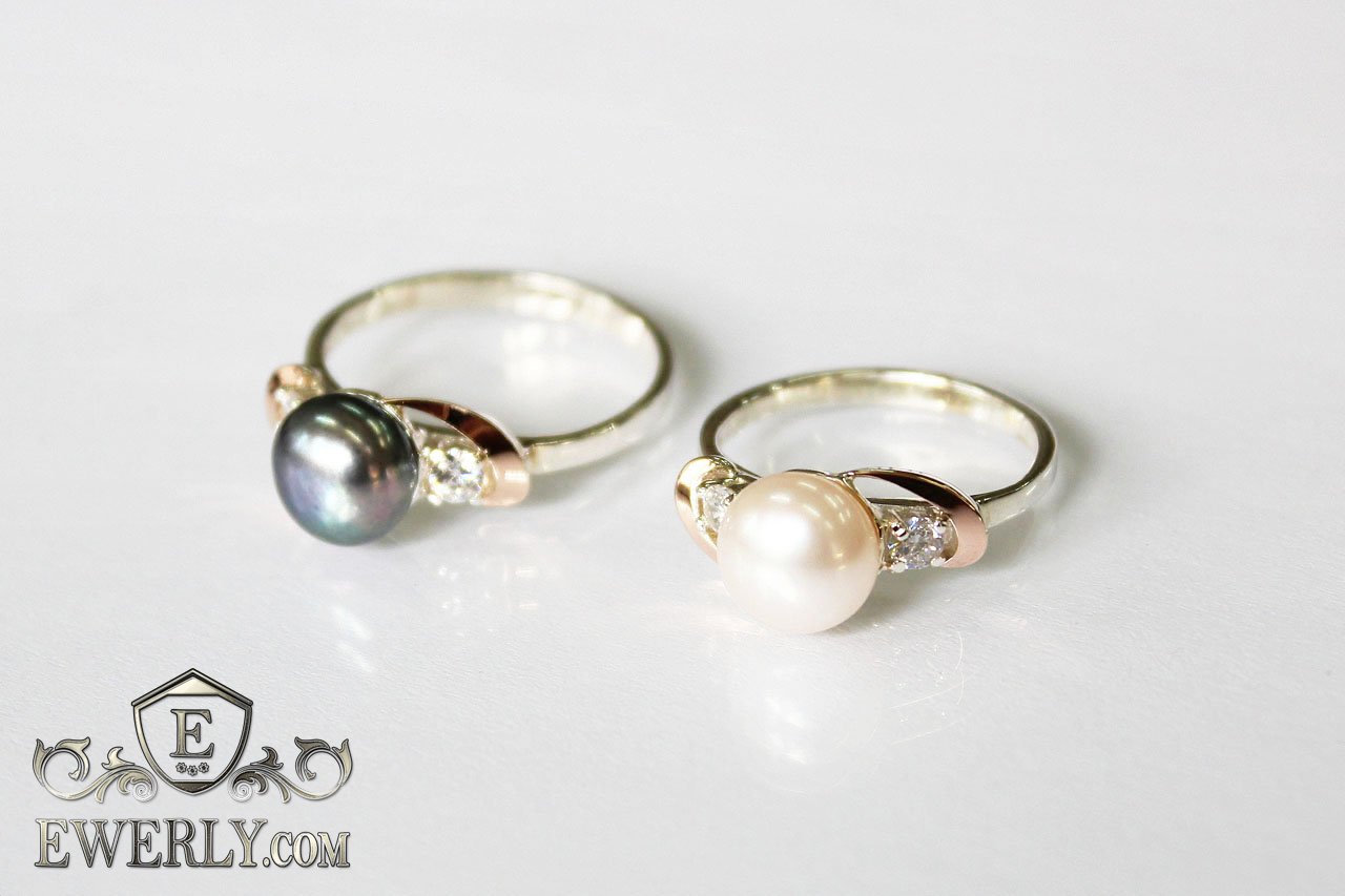 Женское cеребряное кольцо 925 пробы с золотыми вставками 375 пробы с камнем (белый фианит - жемчуг).