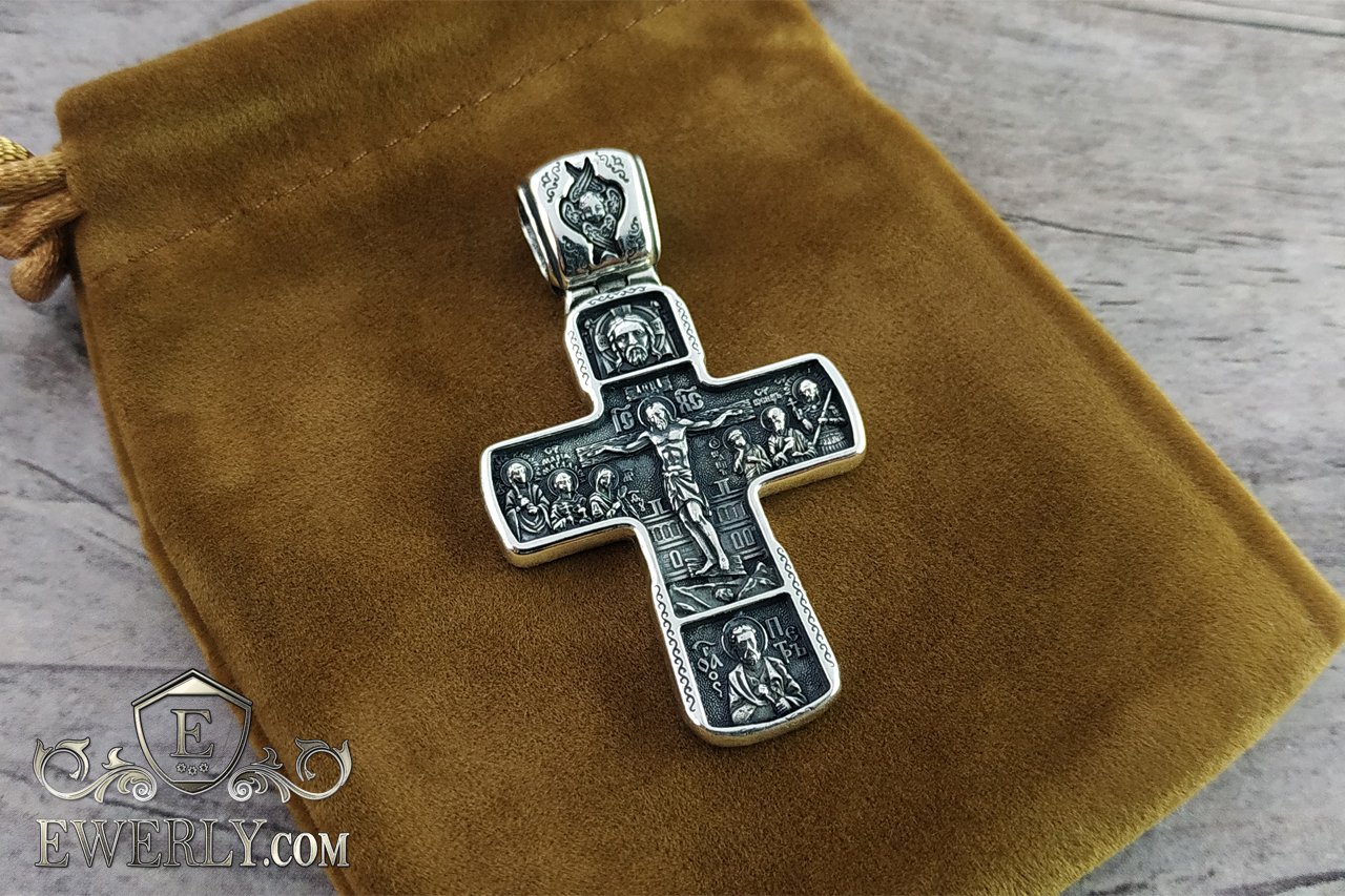 Серебряный крест на шею с чернением. Распятие Христово с предстоящими